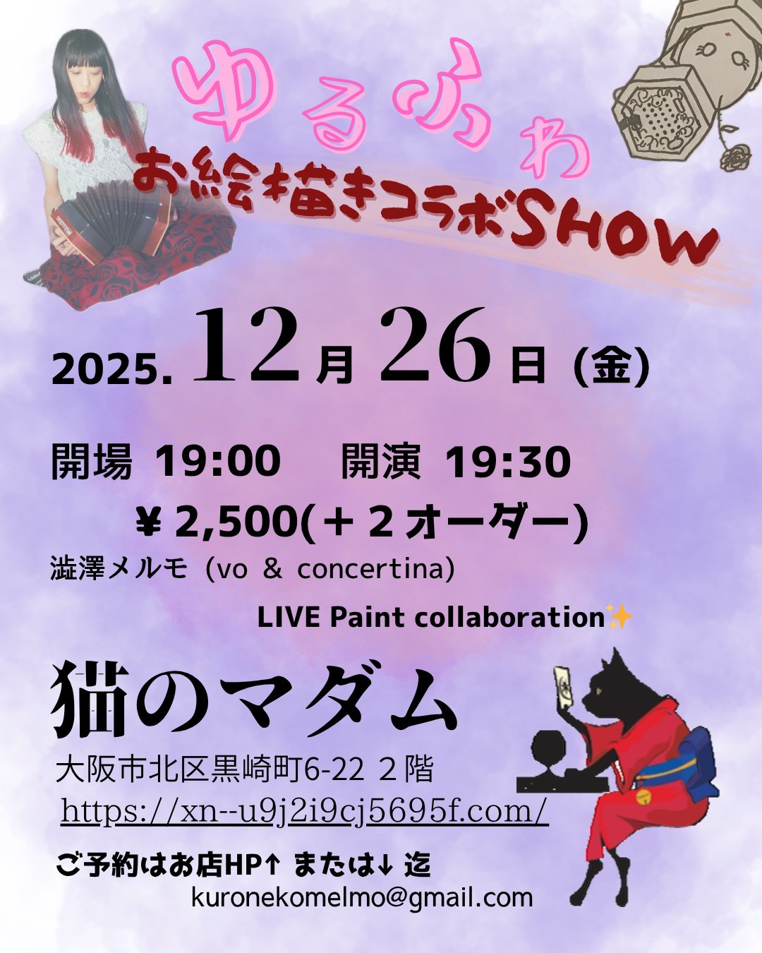 開場: 19:30 開演: 20:00 ¥2,500(+2 order) ゆるふわ お絵描きコラボSHOW(仮) 澁澤メルモ(vo,concertina) LIVE paint🎨 コラボ